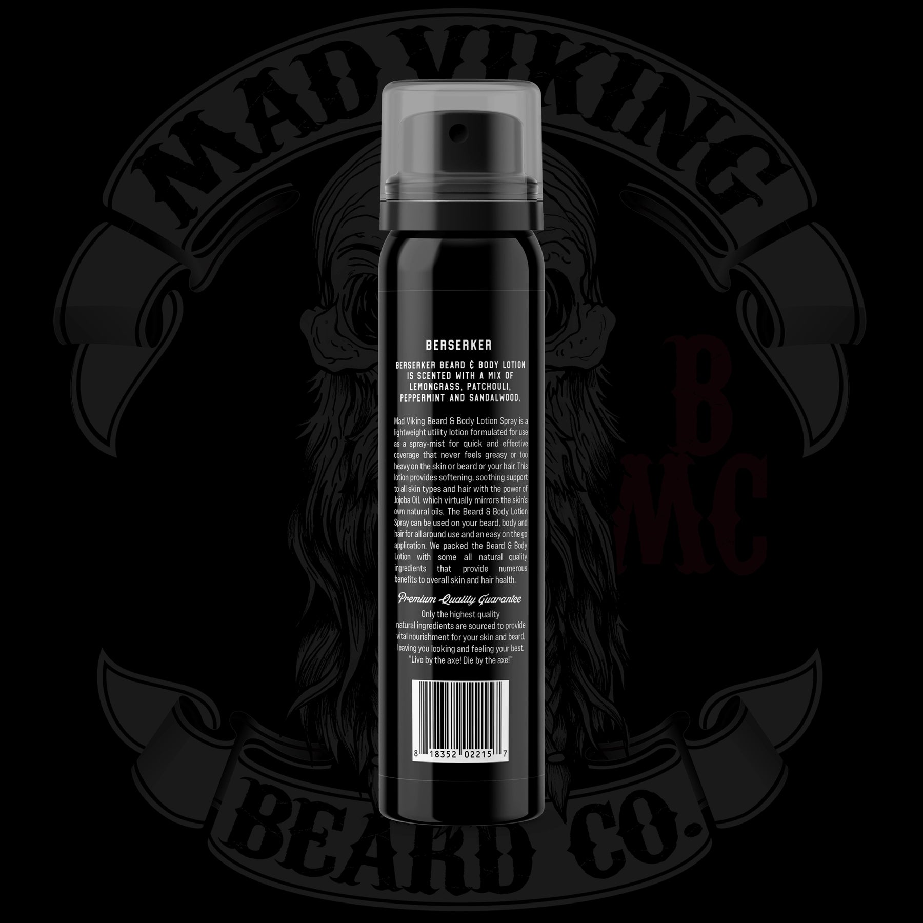 Berserker Beard & Body Lotion Spray is a lightweight utility lotion formulated for use as a spray-mist for quick and effective coverage that never feels greasy or too heavy on the skin or beard or your hair. This lotion provides softening, soothing support to all skin types and hair with the power of Jojoba Oil, which virtually mirrors the skin's own natural oils. The Beard & Body Lotion Spray can be used on your beard, body and hair for all around use and an easy on the go application. We packed the Beard & Body Lotion with some all natural quality ingredients that provide numerous benefits to overall skin and hair health.