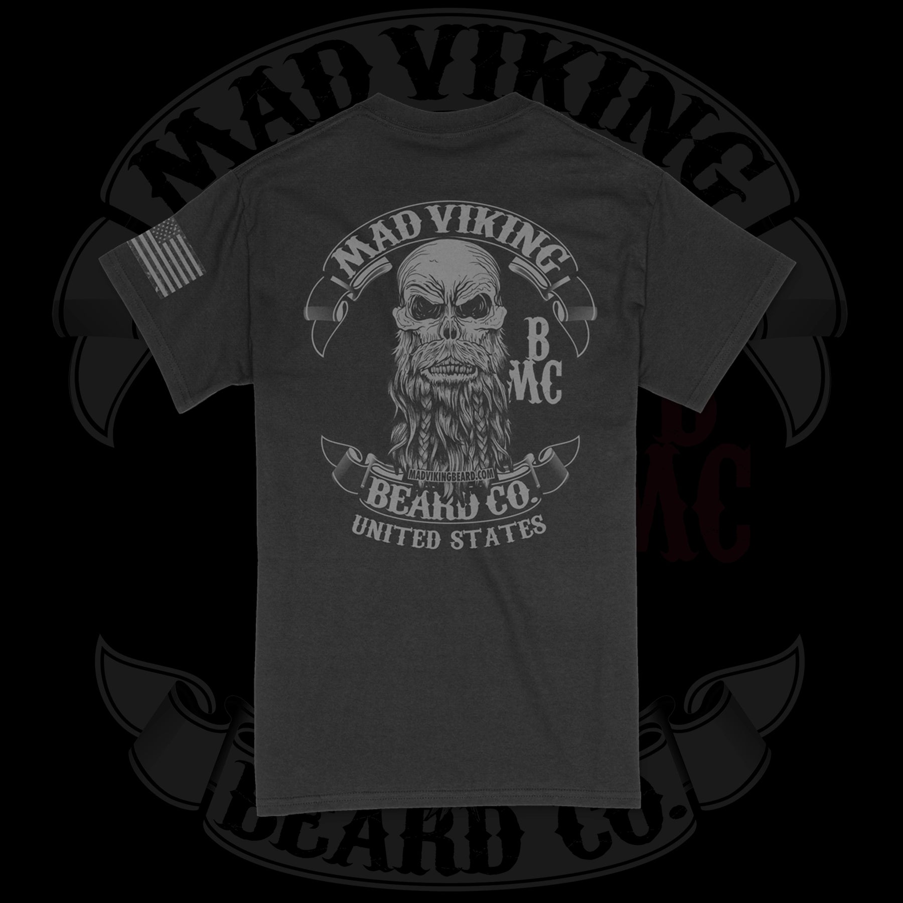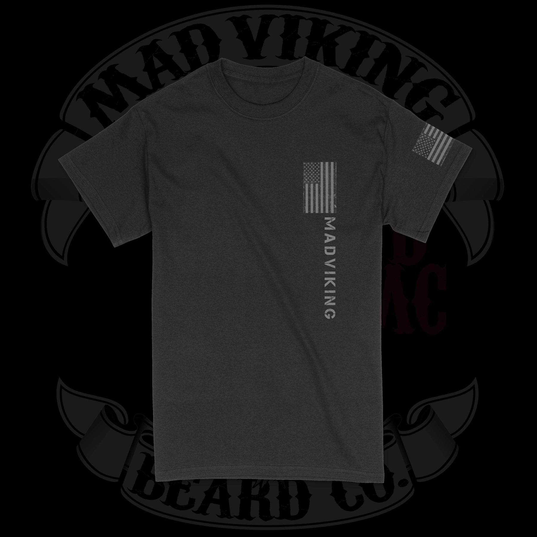 The Mad Viking USA Blackout Tee, aka the “Blackout” is one of our most popular shirts on the market!  The black on black print looks seriously hardcore.  Perfect for the berserker in your life who likes to maintain a low key appearance.  The Blackout is strong enough to get its point across without being loud.  The Tee has our original blackout logo on the back with “United States” printed underneath.  The design also features a blacked out version of the stars and bars, with Mad Viking written vertically.  The logo contains the BMC which stands for Beard and Mustache Club and pays homage to our charity driven beard clubs around the world.